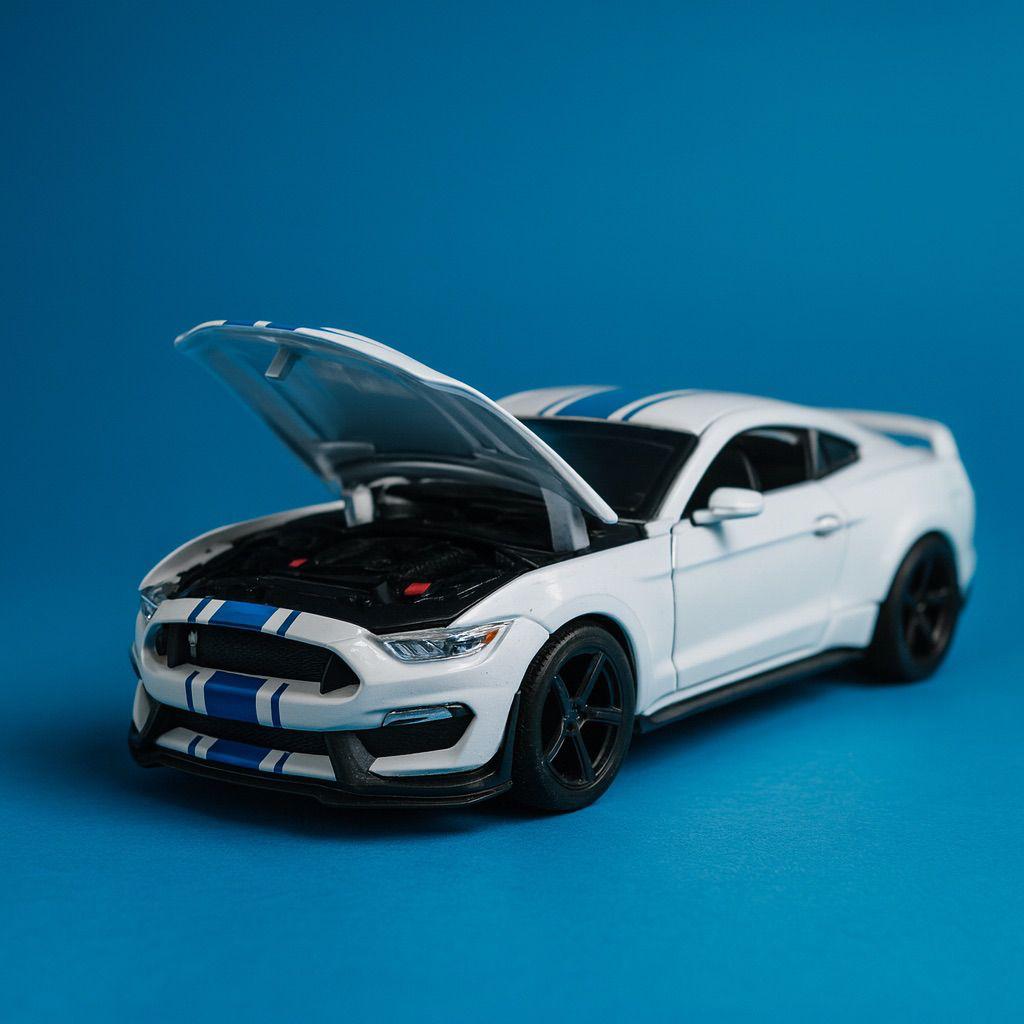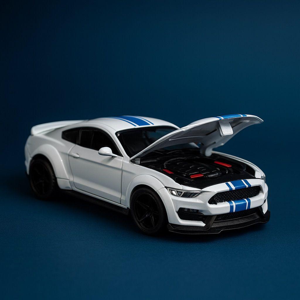Bring American muscle to your shelf with this white die‑cast sports car model inspired by the iconic Shelby‑style GT. The low stance, sculpted hood, and twin blue racing stripes give it a track‑ready look, while the opening hood reveals a detailed engine bay that collectors and kids will love exploring. Its clean white‑and‑blue color combo photographs beautifully for reels, flat‑lays, and themed room décor.
